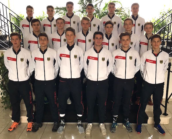 Das deutsche Team in Belgien. Von links, hinten: Nick Werner, Erik Kleinlein, Matteo Poljaric, Elias Mazkour, Mats Philippsen, Mario Schachner; Mitte: Luca Wolff, Moritz Frey, Robert Köpp, Jannis Collée, Aron Flatten, Elias Friedrich; vorne: Timo Kossol, Moritz Ludwig, Konstantin Junke, Benedikt Schwarzhaupt, Max Wollweber, Jonas Seidemann.