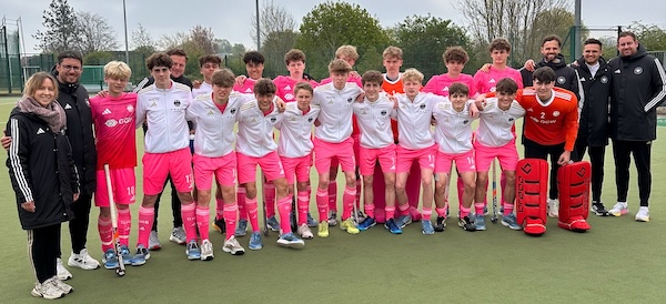 Die Männliche U16 in Tonbridge. Von links, hintere Reihe: Tobias Bergmann (Co-Trainer), Lucas Rees, Tim Green, Peter Linden, Luca Zumhagen, Alexander Fürnthaler, Julius Jacobi, John Odewald, Sascha Overschmidt (Teammanager), Marvin Erxleben (Athletiktrainer), Tobias Jordan (Bundestrainer); vordere Reihe: Franziska Wahl (Physio), Andreas Kniebühler (Torwart-Trainer), Max Krueger, Luis Duft, Jonas Schmidt-Busse, Leonard Roos, Hannes Tietz, Friedrich Heimeier, Jonathan Kahlenberg, Felix Mannl, Carlo Schütz, Moritz Cazin, Janus Schiffer.